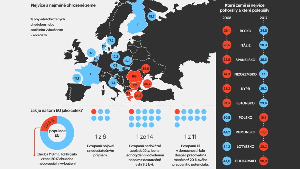 Necelé čtvrtině EU hrozí chudoba nebo sociální vyloučení. V přepočtu na čísla se jedná o téměř 113 milionů lidí. Nejhůře si vedou země jako Bulharsko nebo Rumunsko. Za posledních 10 let se situace nejvíce zhoršila v Řecku. ČR se drží stranou: chudoba tu hrozí nejnižšímu procentu obyvatel z celé EU.