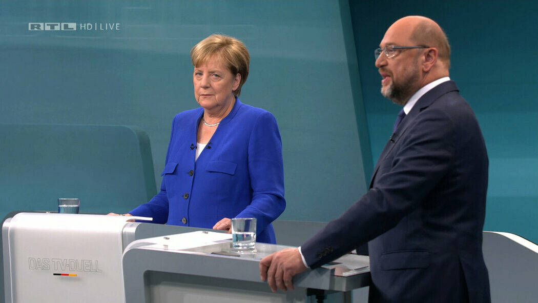 Německá kancléřka Angela Merkelová, předsedkyně vládnoucí Křesťansko-demokratické unie (CDU), se utkala v očekávaném televizním duelu se svým vyzyvatelem, lídrem sociální demokracie SPD Martinem Schulzem. Devadesátiminutový slovní souboj odvysílaly souběžně čtyři celoplošné stanice (ARD, ZDF, RTL a Sat.1). Jejich nejlepší moderátoři kladli dotazy, na jejichž zodpovězení měli politici vždy dvě minuty.