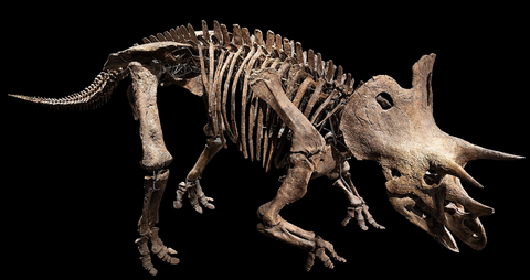 To je, familiárně mu říkáme Trik. Je to Triceratops horridus a aktuálně je to největší a nejkompletnější kostra svého druhu na světě. Měří asi 8,5 metru a vážil kolem 12 tun.