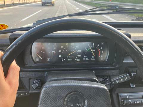Zhruba do stovky se škodovka pohybuje svižně, pak ale rychle ztrácí energii. Nad 120 km/h už motor začíná znít trochu nezdravě a dál na pětku zrychluje jen velmi zvolna – mimochodem, když chcete tento rychloběžný převod zařadit, je potřeba zaplout pákou až kamsi mezi nohy spolujezdce. Na dálnici proto v táhlém stoupání u Naháče přejíždím do kamionového pruhu, řadím čtyřku a doufám, že rychlost zůstane alespoň nad stovkou nebo 110 km/h.
