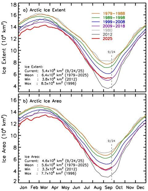 Satelitní data, která jsou systematicky sbírána od roku 1979, ukazují jasný a statisticky významný dlouhodobý pokles rozlohy arktického mořského ledu. Tento trend je nejvýraznější v září, kdy led dosahuje svého ročního minima.