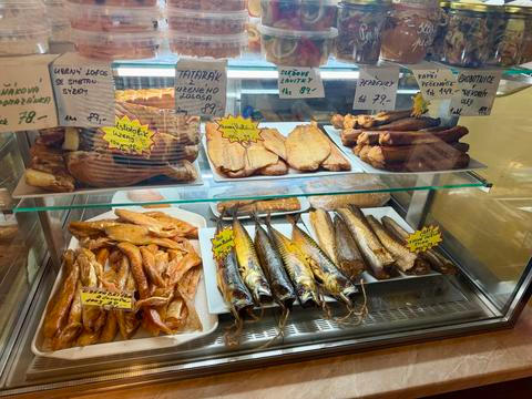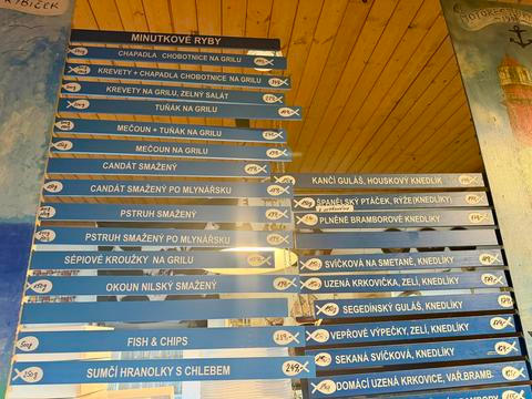 Specialita? Ryby, samozřejmě. Z vlastní udírny dostanete kapra, matjesy, lososa i mořské speciality jako chobotnici, tuňáka či mečouna. Milovníci sladkovodních ryb si přijdou na své s pstruhem, sumcem nebo candátem. K tomu domácí saláty – „Babiččiny rybičky“ za rozumných 49 Kč za 10 dkg patří k nejoblíbenějším. Nechybí ani klasika: svíčková za 179 Kč je podle obsluhy vůbec nejžádanějším jídlem z menu. Skvělý je také guláš, řízky nebo maďarské halászlé.