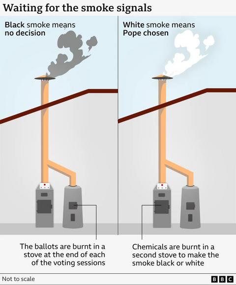 Jenže ne vždy měl kouř po průchodu dlouhou spalinovou cestou jednoznačnou barvu – například ještě při volbě v roce 2005 (kdy se stal papežem německý kardinál Ratzinger jako Benedikt XVI.) bylo obtížné rozlišit, zda je kouř bílý, nebo černý.