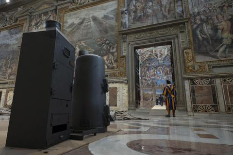 Přes půl tisíciletí stará Sixtinská kaple se svými legendárními stropy a klenbami posetými propracovanými freskami nebyla původně konstruovaná na kouřovou signalizaci, takže při instalaci komína a související spalinové cesty je třeba postupovat s velkou opatrností a ohleduplností vůči historickému dědictví – bohatě stačilo dlouhodobé poškozování maleb kouřem z plápolajících svic.