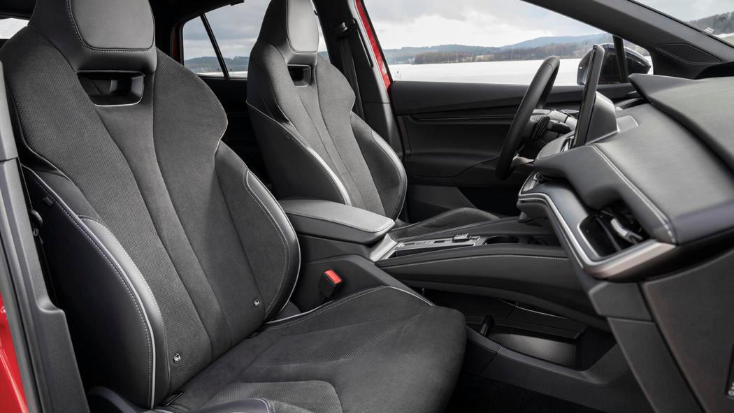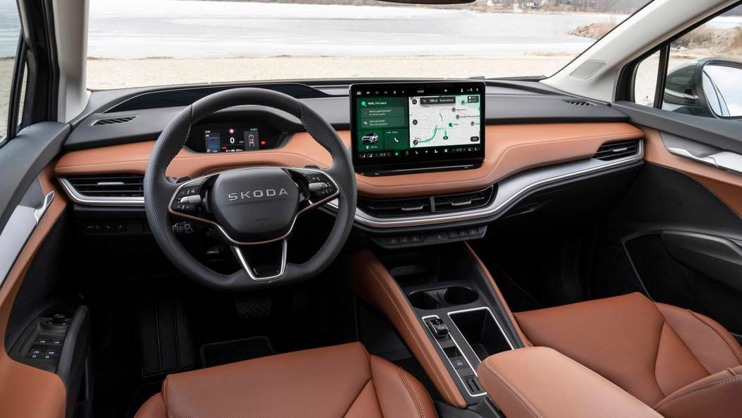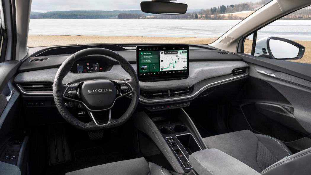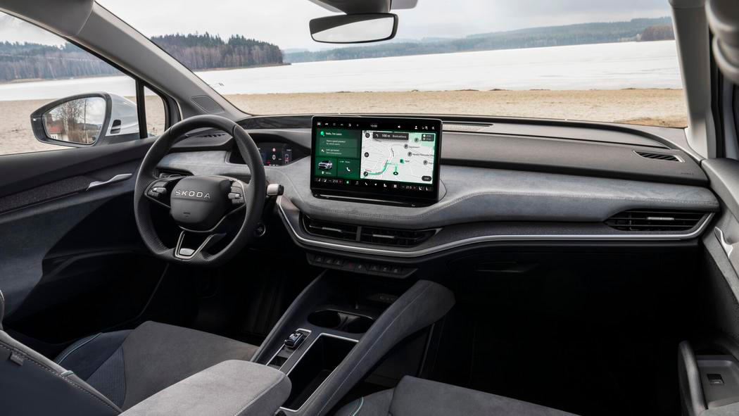 Uvnitř se Enyaq na pohled moc nezměnil – minimálně, pokud jde o architekturu. Přesto je atmosféra uvnitř trochu odlišná. Stačí vlastně detaily jako recyklované látkové potahy sedaček, volant bez klasického loga s okřídleným šípem a nechybí samozřejmě ani nejnovější verze multimediálního systému nebo chytřejší head-up displej. Novými digitálními funkcemi za příplatek jsou parkování na dálku a uložený parkovací manévr.