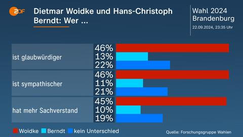Jeho výhra však má trpkou příchuť. Ve srovnání s lídrem kandidátky AfD, Hans-Christophem Berndtem, je Dietmar Woidke pro voliče důvěryhodnější (46 vs. 22 procent), sympatičtější (46 vs. 21 procent) a kompetentnější (45 vs. 19 procent), přesto vyhrál jen o fous.