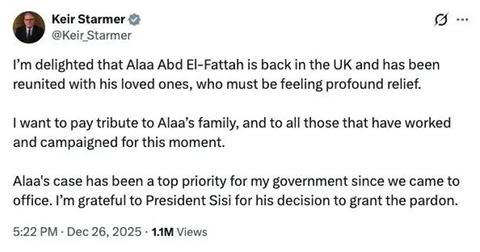 V prosinci bylo umožněno el-Fattahovi — opět po intervenci britských politiků — opustit Egypt a přiletět do své nové „domoviny“, tedy do Anglie. Jeho přílet se stal sledovanou událostí; britský premiér prohlásil, že je „nadšený“ z toho, že se celou věc podařilo dotáhnout do konce, že tento případ byl „top prioritou“ jeho vlády a přesun el-Fattaha z Káhiry do Londýna byl oslavován jako triumf lidskoprávní agendy. Ve svém postu na síti X britský premiér píše: „Jsem nadšený, že Alaa Abd el-Fattah je zpět ve Velké Británii a znovu se setkal se svými milovanými, kteří musí pociťovat obrovskou úlevu. Chtěl bych složit poklonu jeho rodině a všem těm, kteří pracovali a lobovali za tento okamžik. Případ Alay byl top prioritou mé vlády od okamžiku, kdy jsme se ujali úřadu.“