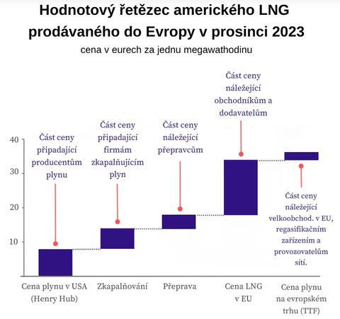 Příčin je několik. Jedna z nich je nákladová. Před samotným transportem je třeba plyn zkapalnit, po převozu skladovat a nakonec znovu vrátit do plynného skupenství. Každá firma zapojená do tohoto řetězce si ovšem připočítává marži, kterou nakonec zaplatí spotřebitel. Výsledkem je, že plyn, který je na americkém obchodním uzlu Henry Hub oceňován na necelých 10 eur za megawatthodinu, se na evropské referenční burze v Rotterdamu prodává za téměř 40 eur.