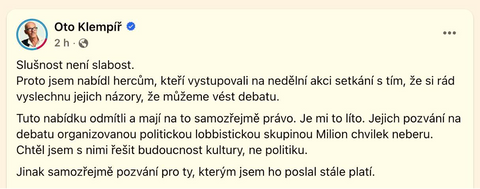 Ponechme stranou, že pokud jde o lobbismus, jsou Motoristé o několik pater výš než „chvilkaři“. Klempíř se však střelil do vlastní nohy především tím, že v postu na Facebooku následně tvrdil, jak chtěl diskutovat o budoucnosti kultury, nikoli o politice. Proč o ní tedy chtěl diskutovat zrovna s těmi, kdo se vymezili proti Petru Macinkovi?