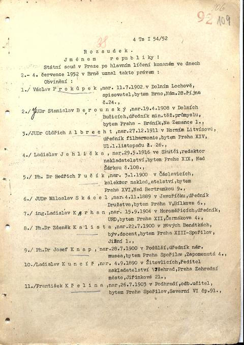 V procesu s tzv. Zelenou internacionálou byly vyneseny drastické tresty: Václav Prokůpek 22 let, Stanislav Berounský 20 let, Oldřich Albrecht 20 let, Ladislav Jehlička 14 let, Bedřich Fučík 15 let, Miloslav Skácel 17 let, Ladislav Karhan 18 let, Zdeněk Kalista 15 let, Josef Knap 11 let, Ladislav Kuncíř 10 let, František Křelina 12 let, Václav Hovězák 17 let, František Kadrnka 5 let a Jan Langr 7 let vězení nepodmíněně. Všichni byli obviněni z velezrady a špionáže.