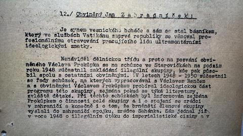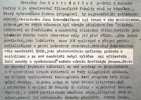 S odstupem desítek let je téměř nepředstavitelné, jaké absurdní skutky jim byly dávány za vinu. Básník Jan Zahradníček byl zatčen 14. června 1951 v půl osmé ráno. Tajná policie jej umístila do znojemské vazební věznice. V obžalobě vypracované JUDr. Bohumilem Zieglerem 23. června 1952 se o něm uvádí: „Je synem vesnického boháče a sám se stal básníkem, který ve službách Vatikánu za první (!) republiky se věnoval profesionálnímu otravování pracujícího lidu ultramontánními ideologickými zmatky.“
