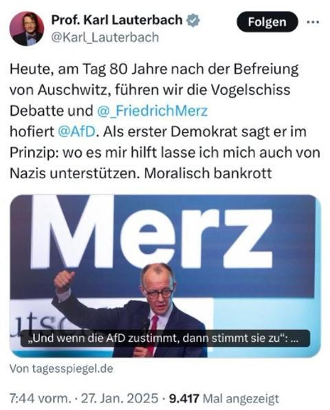 Za již smazaný tweet z 27. ledna se Lauterbach sice omluvil, šéf CDU však jeho omluvu před celým Spolkovým sněmem veřejně odmítl. Nebyl totiž první Lauterbachovou podpásovkou typu „reductio ad Hitlerum“ na jeho adresu.