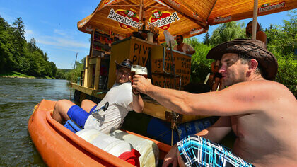 Tady to ještě proud vody zvládne, ale o něco dál už je jasné, že plavidlo je na předku poněkud přetížené, proto musí Ivan Bartoš zanechat sobě vlastních tanečních kreací a zapojit se do přetahování raftu přes mělčinu. Ač je to v tomto případě zjevně nutné, je toto počínání z přírodního hlediska krajně nevhodné, neboť nohy vodáků hamtající po dně vážně narušují funkce podvodních ekosystémů.