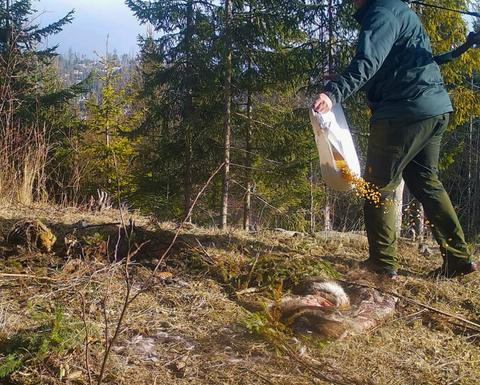 Jak je vidět z některých fotografií z fotopastí, myslivci ještě posypávají mršiny například kukuřicí – tedy potravou, které jiné šelmy než medvědi nejedí.