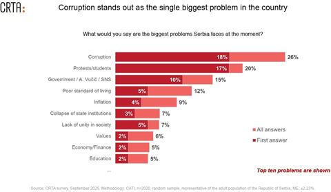 Dále z průzkumu plyne, že „polarizace je patrná v tom, co lidé považují za největší problémy Srbska: pro 26 procent je to systémová korupce, pro 20 procent jsou to studenti a blokády.“