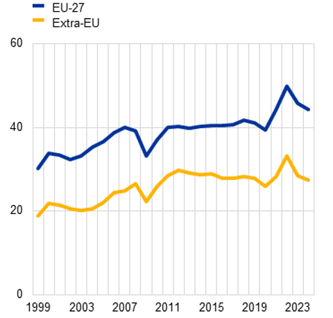 Evropská komise si je nedostatků velmi dobře vědoma. V pravidelné Výroční zprávě o stavu společného trhu koncem ledna poukazuje na „kombinaci vnějších tlaků a vnitřních překážek“, jež způsobuje „erozi průmyslové základny“. Úpadek se projevuje už i statisticky – mezi roky 2023 a 24 se obchod se zbožím mezi zeměmi EU snížil o procento a půl, z 23,5 na 22 procent celkového objemu. Je to první pokles po 30 letech soustavného růstu.