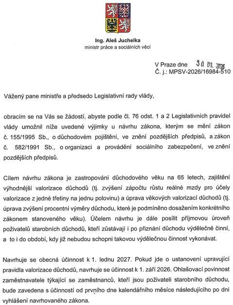 Jenže změnu zákona není možné při dodržení všech řádných lhůt na připomínky zvládnout tak rychle. Juchelka proto v dopise požádal ministra spravedlnosti Jeronýma Tejce a Legislativní radu vlády, aby se zvýšení a uvolnění penzí protáhlo vládou bez připomínkového řízení.