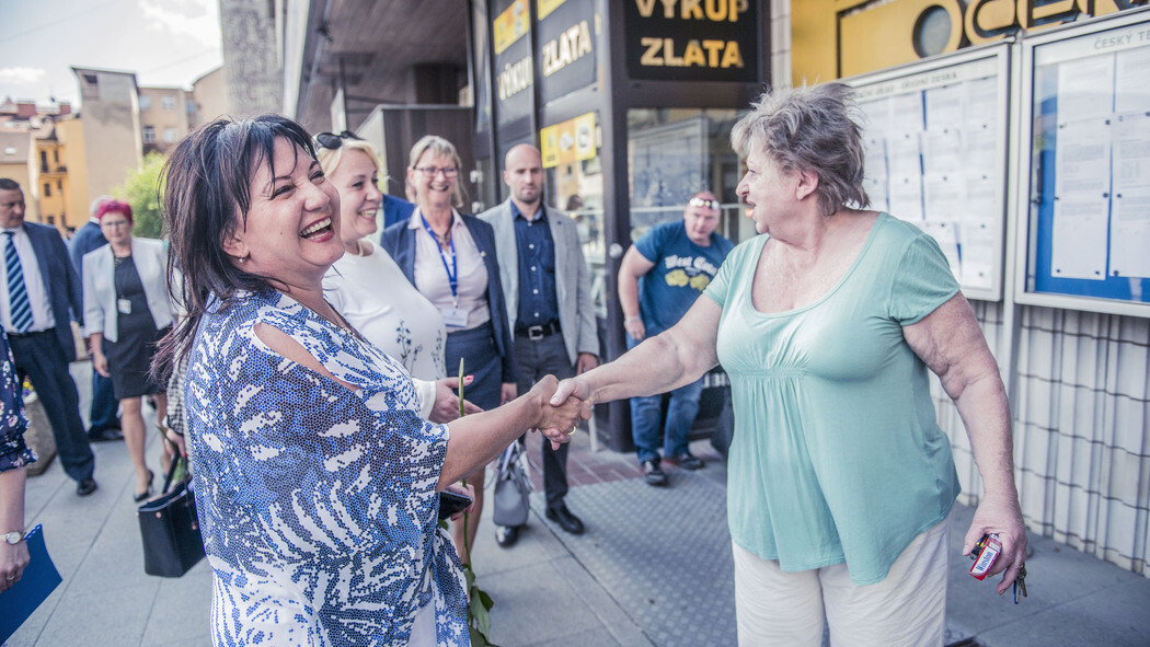 Z místa uprostřed silnice se chvíli rozhlíží po okolí, pak už ho obestoupí dav novinářů se zapnutými kamerami. Na místní obyvatele, kteří se drží opodál a zvědavé pokukují, přes ně téměř nevidí. „Komu patří tyhle domy?“ obrací se na ústeckou primátorku Věru Nechybovou a místostarostu Karla Kariku. „To jsou všechno soukromí vlastníci. Proto s tím nemůžeme nic dělat,“ zní mu v odpověď.