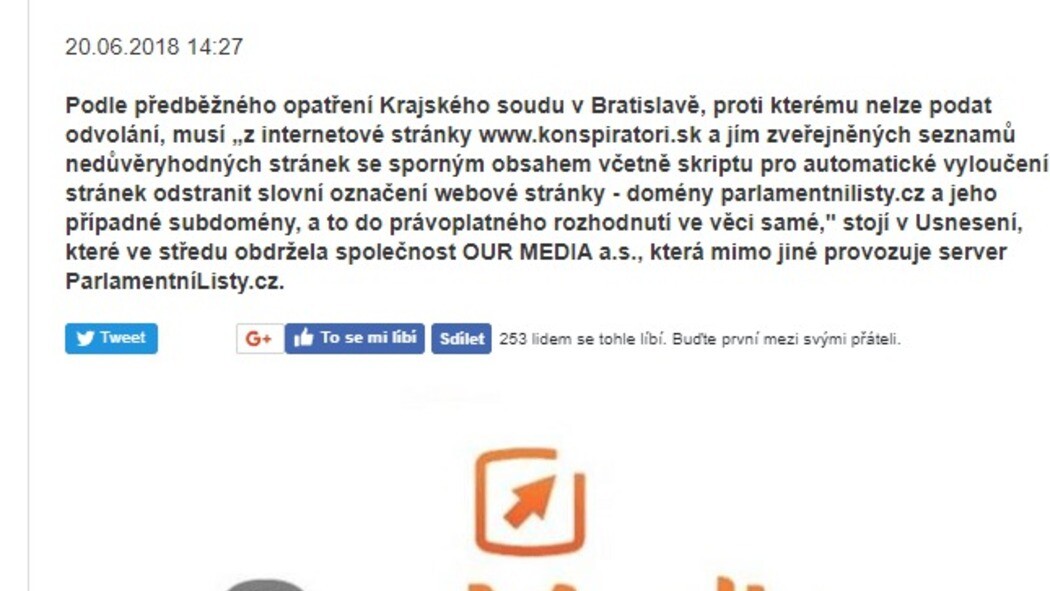 Společnost OUR MEDIA a.s., která mj. zajišťuje chod zpravodajského serveru Parlamentní listy, vydala již minulou středu zprávu o tom, že Krajský soud v Bratislavě údajně vydal předběžné opatření týkající se internetové stránky www.konspiratori.sk a jím zveřejněných seznamů nedůvěryhodných stránek. Parlamentní listy tvrdí, že podle rozhodnutí soudu musí Konspiratori.sk (z již zméněného seznamu) odstranit slovní označení jejich webové stránky. Tedy domény parlamentnilisty.cz i všech subdomén.