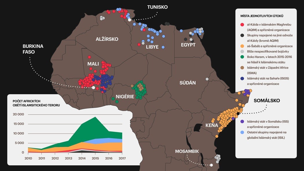 K nejznámější skupinám patří nigerijská organizace Boko Haram nebo somálské Hnutí mladých bojovníků, nebo-li Aš-Šabáb. Na černém kontinentu ale operují i al-Káida a Islámský stát. Podle expertů se světadíl stane důležitou základnou islamistů.